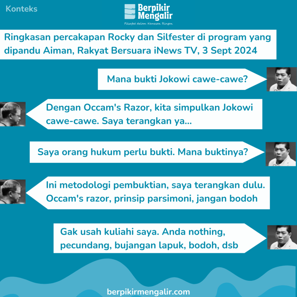Pada 3 September 2024, program Rakyat Bersuara di iNews TV menampilkan perdebatan panas antara Rocky Gerung dan Silfester Matutina terkait prinsip filosofis yang dikenal sebagai Occam’s Razor. Dalam dialog tersebut, Rocky Gerung berusaha menjelaskan konsep ini, namun mendapat reaksi keras dari Silfester yang tidak setuju dengan cara berpikir Rocky.