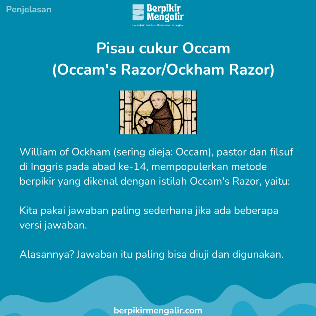 Occam’s Razor, atau Pisau Cukur Occam, adalah prinsip pemikiran yang dipopulerkan oleh William of Ockham, seorang filsuf dan pastor Inggris dari abad ke-14. Prinsip ini menyatakan bahwa ketika dihadapkan dengan beberapa penjelasan yang mungkin untuk suatu fenomena, penjelasan yang paling sederhana dan paling mudah diuji adalah yang paling mungkin benar.